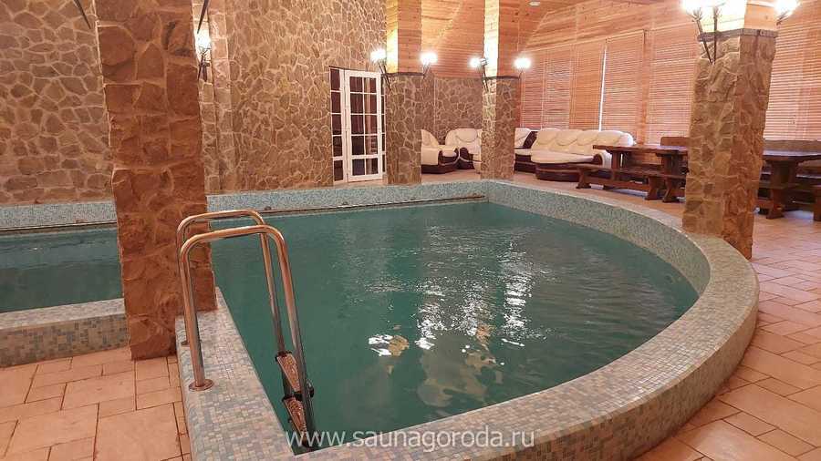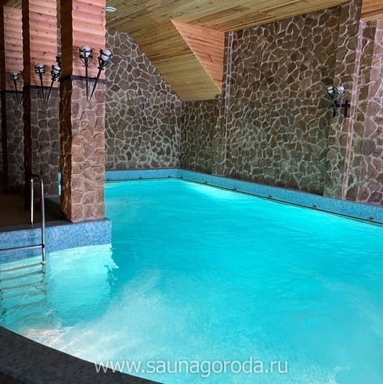 Русская баня с большим теплым бассейном, местом отдыха, чайной зоной и собственной пристанью к озеру, в котором можно купаться.